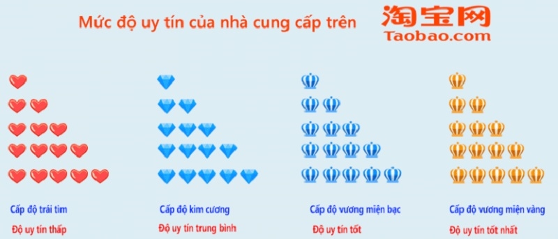 Giống với Taobao, 1688 cũng có cơ chế trừ điểm và giới hạn số lượng giao dịch được tính đối với 1 khách hàng. Nên từ đó trên 1688 có bảng phân chia cấp bậc từ thấp đến cao. Có ba cấp độ đánh giá shop 1688 được đặt cụ thể như Thấp nhất là 1 ngôi sao và cao nhất là 5 vương miện. Dựa trên cấp bậc, thời gian thành lập, và đơn giá sản phẩm, Khách hàng có thể đánh giá được lượng giao dịch liên tục của nhà cung cấp.